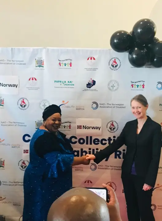 The picture below shows the Minister of Community Development and Social Services Hon. Doreen Mwamba in a blue dress posing for a photo with the visiting Norwegian Association of Disabled (NAD) Chief Advisor Ms. Ingunn Gihle who represented Norwegian partners at the CADIR project launch held on 7th May, 2025, at Urban Hotel in Lusaka.